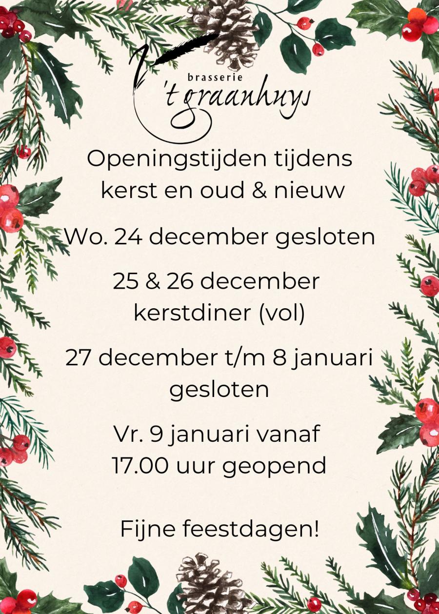 Wij zijn woensdag t/m vrijdag vanaf 17.00 uur geopend, zaterdag en zondag vanaf 12.00 uur. Maandag en dinsdag zijn we gesloten. Probeert u ook gerust buiten onze openingstijden te bellen!